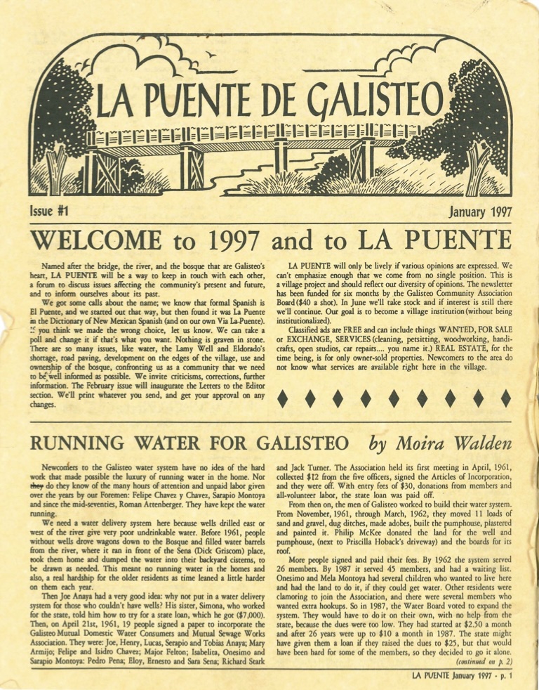 “In January 1997 the first issue of EL Puente de Galisteo came out with the blessing of the Galisteo Community Association and help from several accomplices no longer living here. In homage to colloquial New Mexican Spanish, the newsletter was called La Puente, like the road crossing the bridge. But everyone was horrified, and the second issue was the proper El Puente. “
